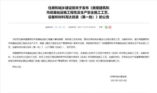 2021年12月14日,住建部印發(fā)的《房屋建筑和市政基礎設施工程危及生產(chǎn)安全施工工藝、設備和材料淘汰目錄(第一批)》明確:房屋建筑和市政基礎設施工程從業(yè)單位要在2022年09月14日后,全面停止在新開工項目中使用本《目錄》所列禁止的施工工藝、設備和材料。