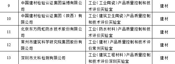 其中,建材行業(yè)共有5家入選,這5家實(shí)驗(yàn)室涉及工業(yè)陶瓷、建筑衛(wèi)生陶瓷、防水材料等領(lǐng)域,分別為中國(guó)建材檢驗(yàn)認(rèn)證集團(tuán)淄博有限公司工業(yè)(工業(yè)陶瓷)產(chǎn)品質(zhì)量控制和技術(shù)評(píng)價(jià)實(shí)驗(yàn)室、中國(guó)建材檢驗(yàn)認(rèn)證集團(tuán)(陜西)有限公司工業(yè)(建筑衛(wèi)生陶瓷)產(chǎn)品質(zhì)量控制和技術(shù)評(píng)價(jià)實(shí)驗(yàn)室、北京東方雨虹防水技術(shù)股份有限公司工業(yè)(防水材料)產(chǎn)品質(zhì)量控制和技術(shù)評(píng)價(jià)實(shí)驗(yàn)室、常州市建筑科學(xué)研究院集團(tuán)股份有限公司工業(yè)(建材)產(chǎn)品質(zhì)量控制和技術(shù)評(píng)價(jià)常州實(shí)驗(yàn)室、深圳市太科檢測(cè)有限公司工業(yè)(建筑工程材料)產(chǎn)品質(zhì)量控制和技術(shù)評(píng)價(jià)深圳實(shí)驗(yàn)室。