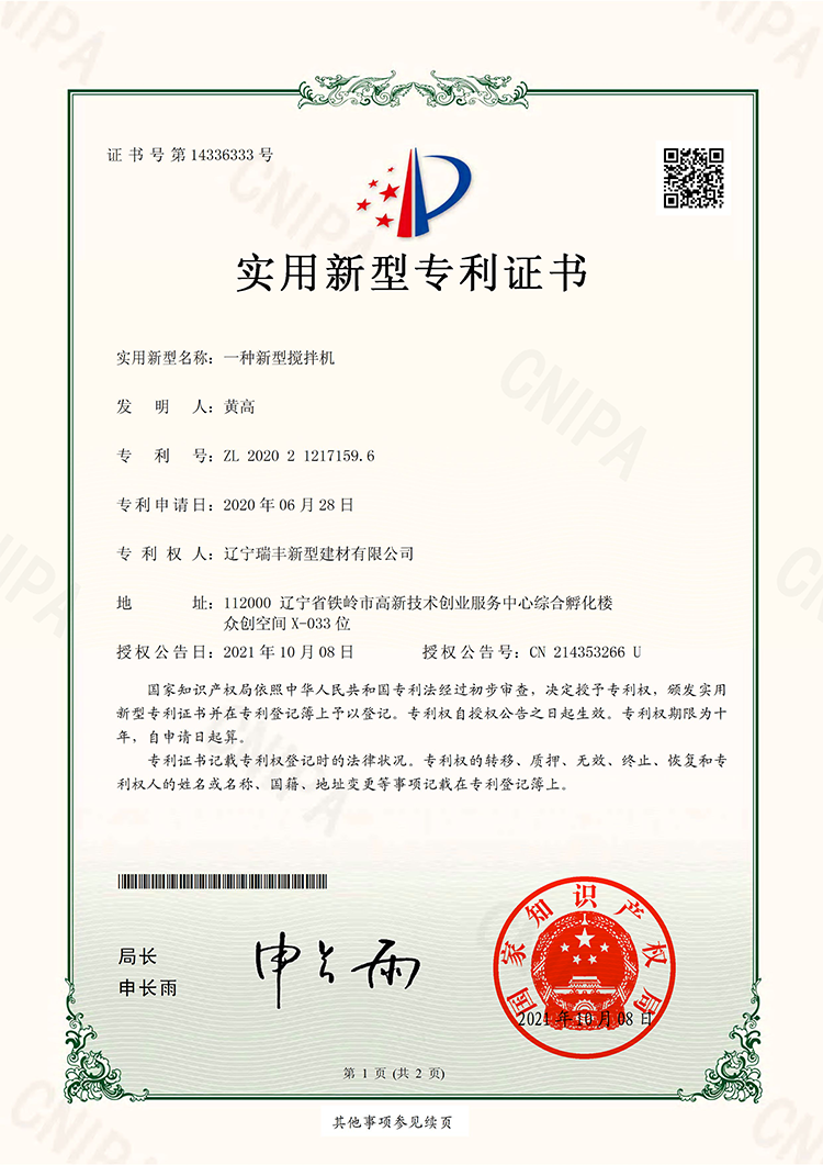 由遼寧瑞豐新型建材有限公司發(fā)明的“一種新型攪拌機(jī)”已于近日獲得國(guó)家知識(shí)產(chǎn)權(quán)局頒發(fā)的實(shí)用新型專利證書。